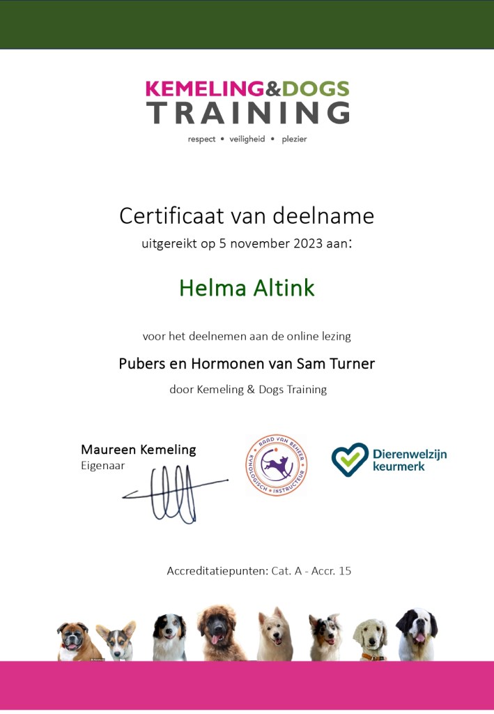 *Zieke honden met bijvoorbeeld diarree, kennelhoest etc. of loopse teven mogen niet deelnemen aan de cursus!! Wij adviseren u dan zonder hond te komen, zodat u thuis wel verder kunt trainen.